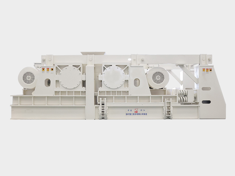 通過電機、減速機以及萬向聯軸器,帶動兩輥輪相對旋轉,相互擠壓物料實現破碎工作。將物料經給料口落入兩輥輪之間,進行擠壓破碎,成品物料自然落下,遇有過硬或不可破碎物時,輥輪可通過液壓缸或彈簧的作用自動退讓,使輥輪間隙增大,過硬或不可破碎物落下,從而保護設備不受損壞。相向轉動的兩輥輪有一定的間隙,改變間隙,即可控制產品的排料粒度。